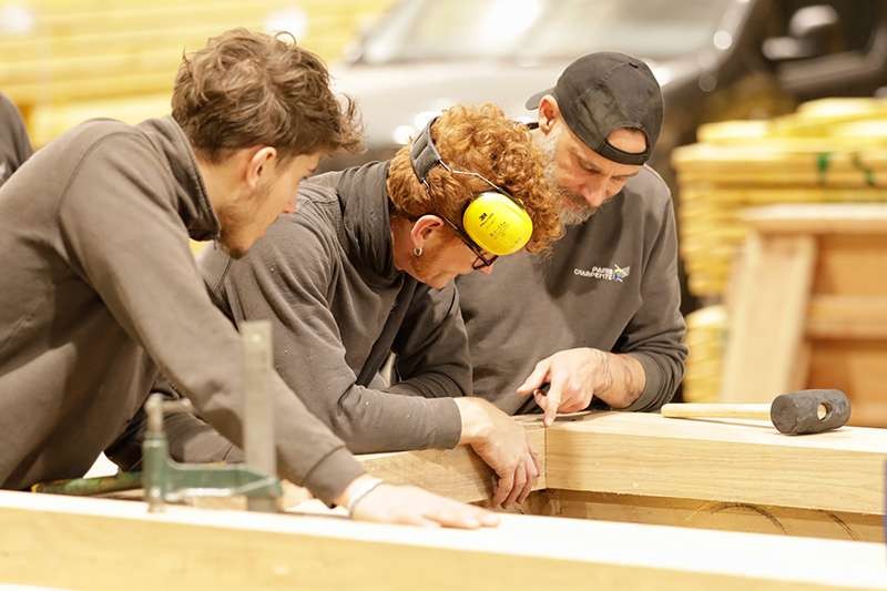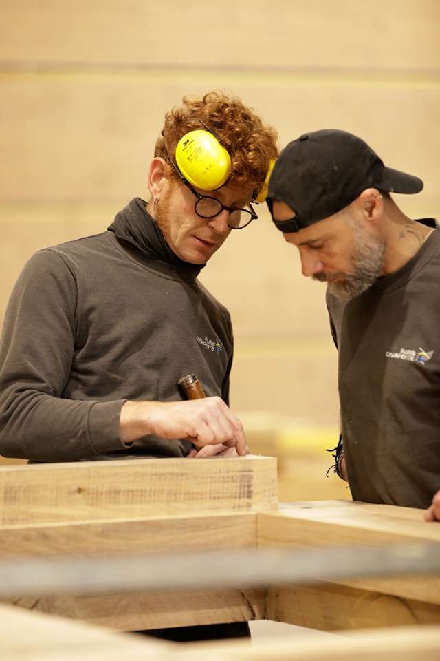 Durant deux ans, ces alternants découvrent toutes les facettes du métier. Ils intègrent les équipes, participent aux différents chantiers et évoluent dans l'atelier. En passant d'une équipe à l'autre, ils acquièrent une expérience variée et complète, directement au contact des charpentiers confirmés. L'objectif est clair : leur transmettre les gestes, les savoirs et l'esprit du métier, en créant un véritable lien entre les générations.