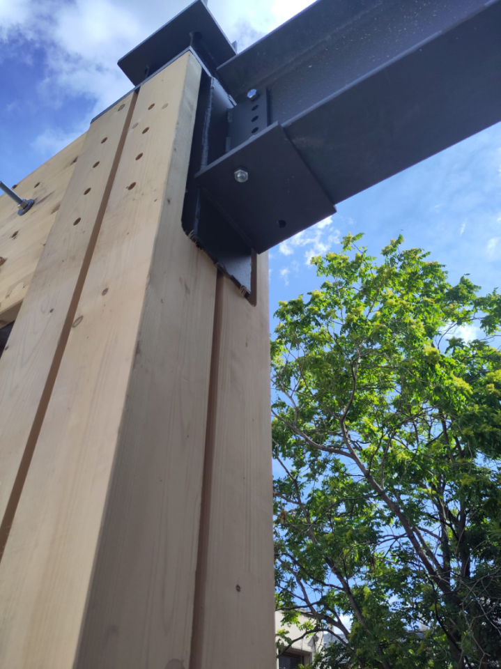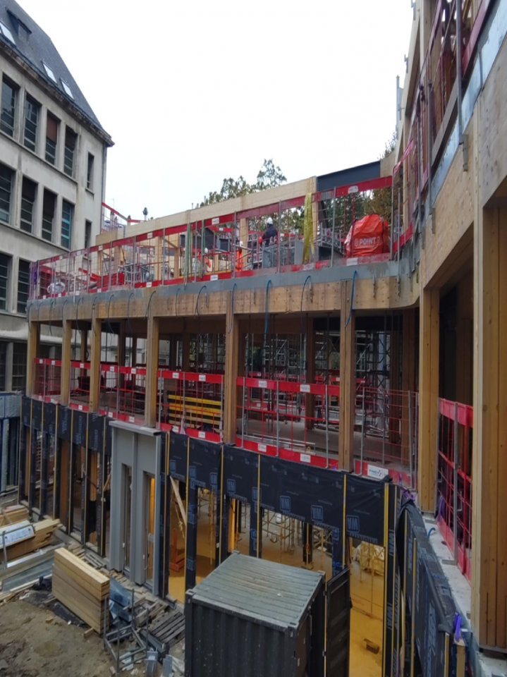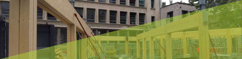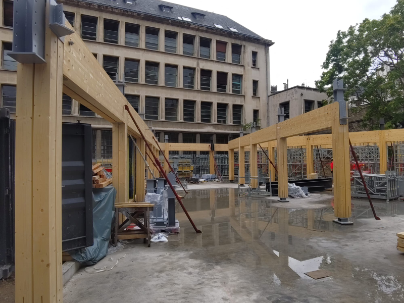 Les équipes de Paris Charpente se sont appuyées sur les compétences de l'entreprise Cosylva pour les éléments en lamellé-collé et de Wall'up pour la fabrication des façades à ossature bois. L'organisation du chantier et le levage ont été assurés par Paris Charpente, à l'aide d'une grue mobile, dans les conditions d'un chantier parisien en arrière-cour, nécessitant une coordination précise et une parfaite maîtrise des phases de montage.