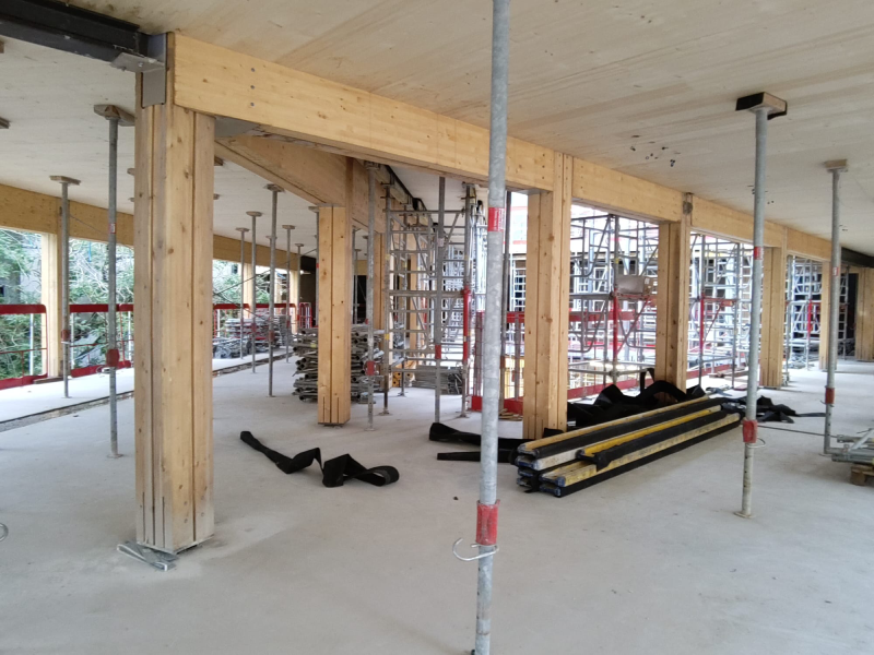 Le nouveau bâtiment est une construction R+2 majoritairement en bois. Il repose sur :
