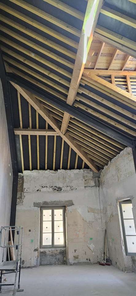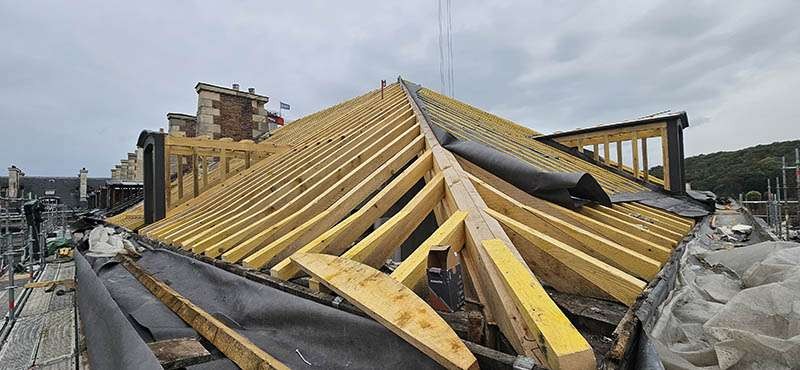 Les lucarnes historiques ont fait l'objet d'une restauration minutieuse. Les charpentiers ont remplacé les pièces de bois défectueuses grâce à la technique de l'enture, qui consiste à découper les parties altérées pour y ajuster parfaitement de nouvelles pièces de bois. Ce procédé traditionnel, exigeant précision et maîtrise, permet de préserver la structure d'origine tout en assurant sa solidité et sa pérennité.