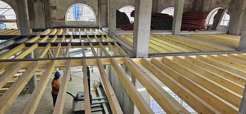 Pour cette deuxième étape, les équipes de Paris Charpente ont réalisé la taille des éléments de charpente dans leurs ateliers de Montreuil avant d'en assurer le levage sur site.